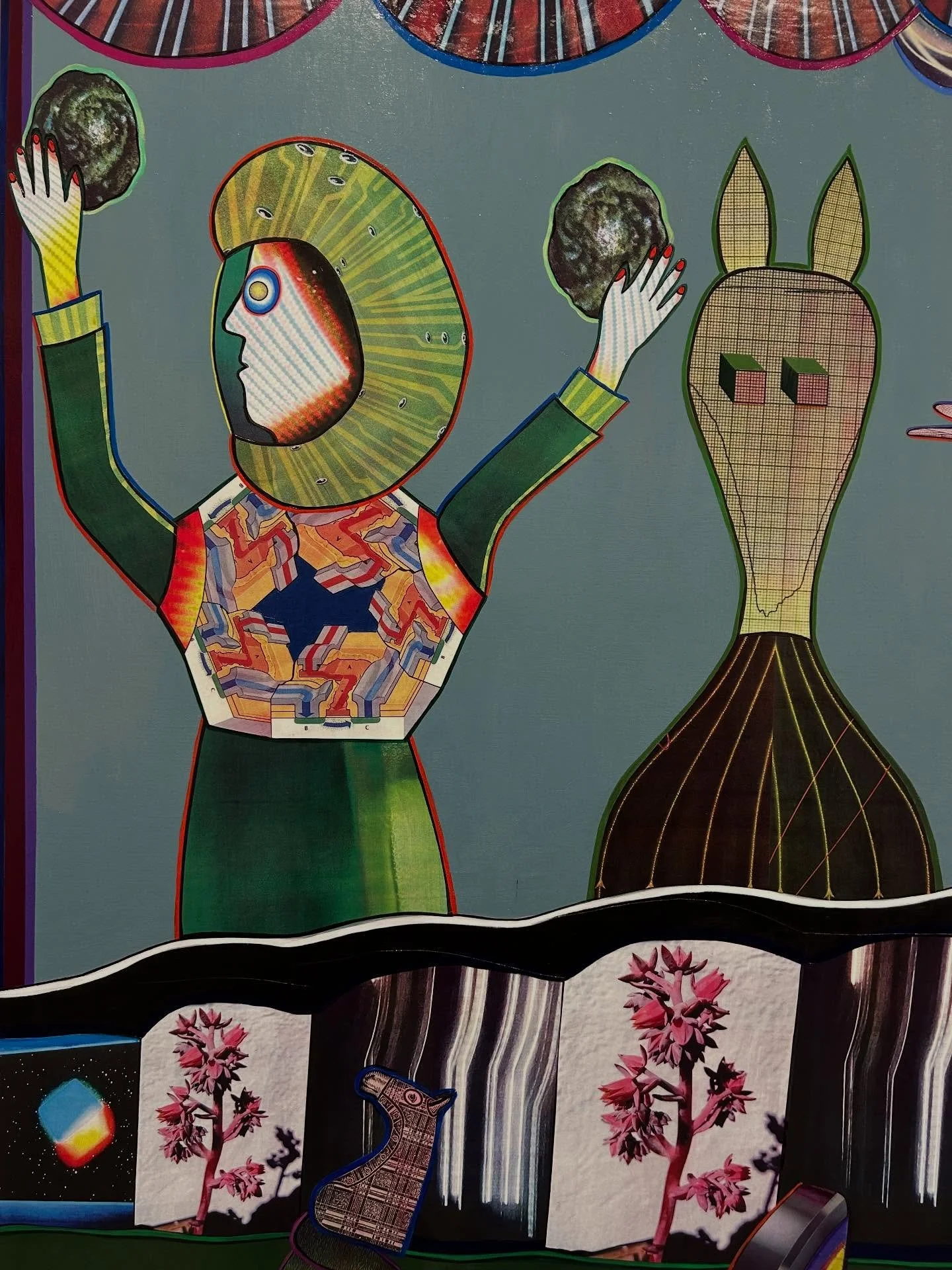 I research and collect images, headlines, and visual phenomenon based on a specific idea and theme for a series. The images come from my photographs, books, magazines, newspapers, the Internet, covers from videos, and anything else I come across that fits the concept in some way. Women characters have always played a major role throughout all of my work. Whether they are human, aliens, robots, androids, clones or a mixture, they rule the worlds and landscapes that I create. I start with a nonobjective painted geometric background. From historical figures to pop icons, scientific breakthroughs to religious symbols, advertisements from the 60s, space exploration to political campaigns, natural disasters to greeting cards, I pick things that are particular to the situation at that moment. There is a logic to the selection process, although it may not seem apparent at first glance. A piece of collage is like a tube of paint, just another material to use. It will come down to what works formally.